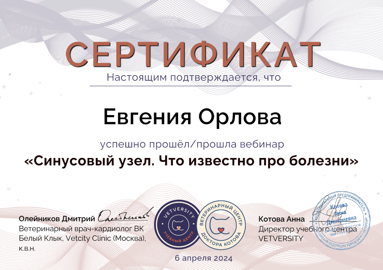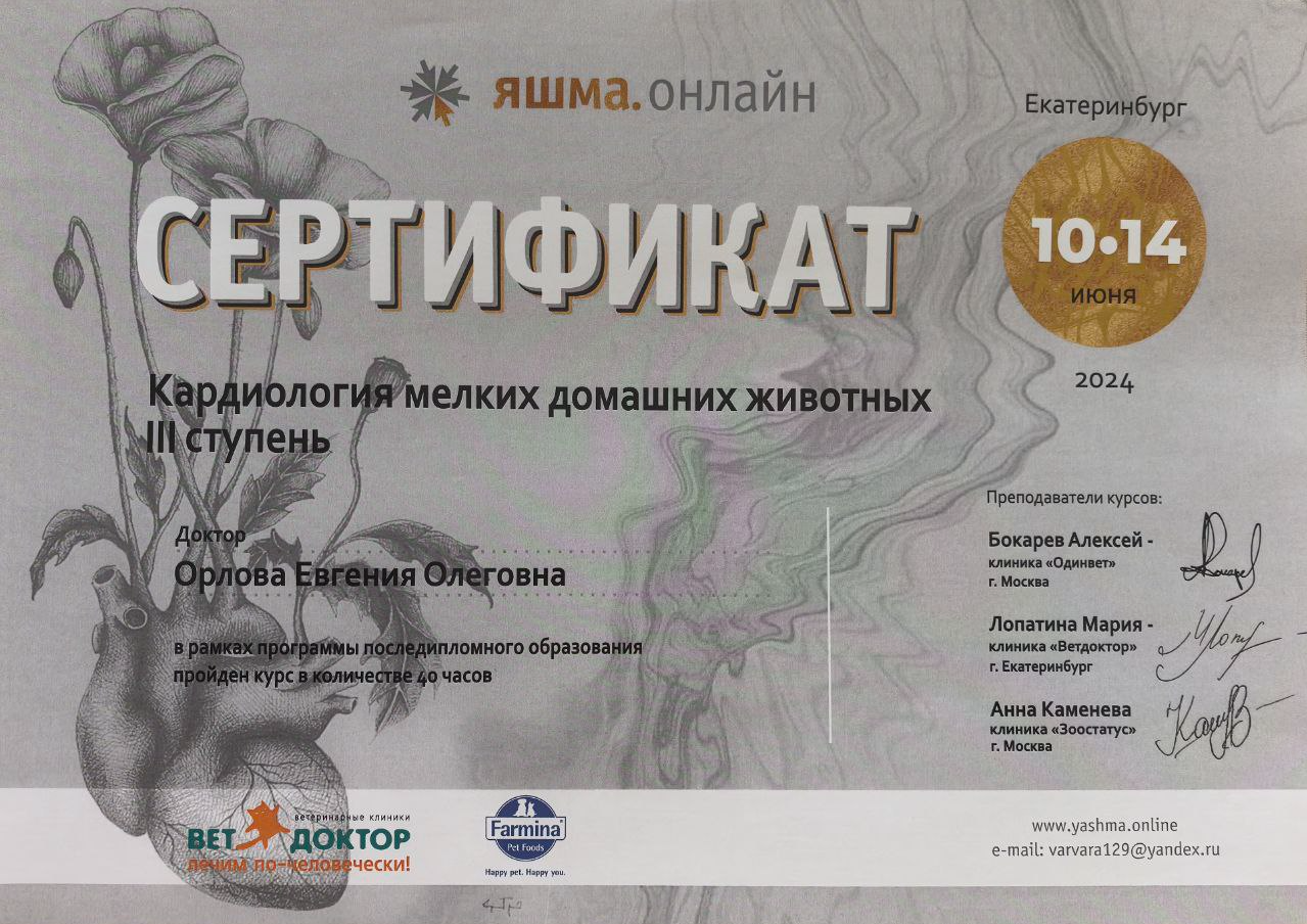 2024 — очный курс по кардиологии мелких домашних животных 3 ступень (40 часов) на базе образовательного центра «Яшма.онлайн», лекторы Бокарёв А.В., Каменева А.В., Лопатина М.Ю.