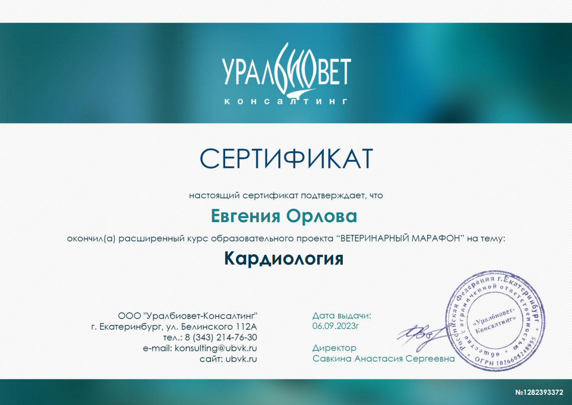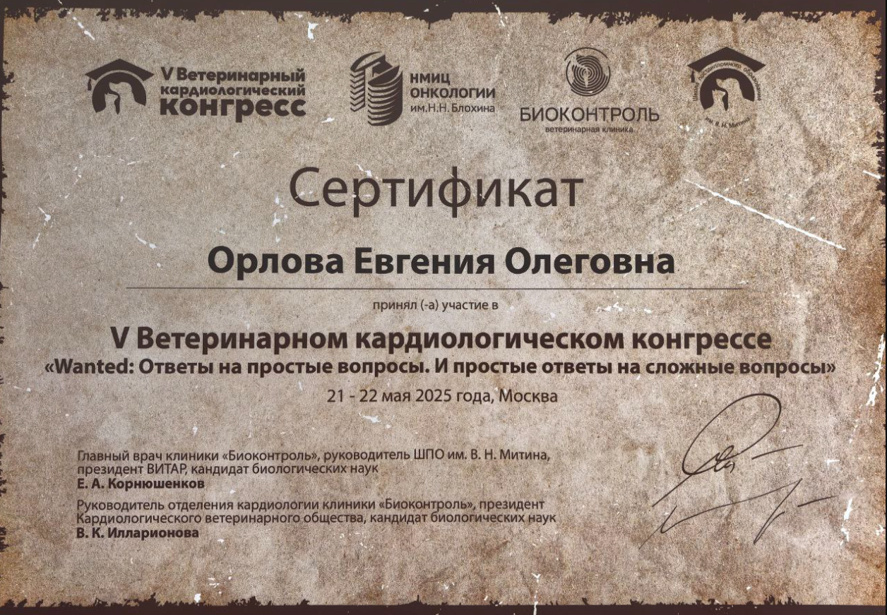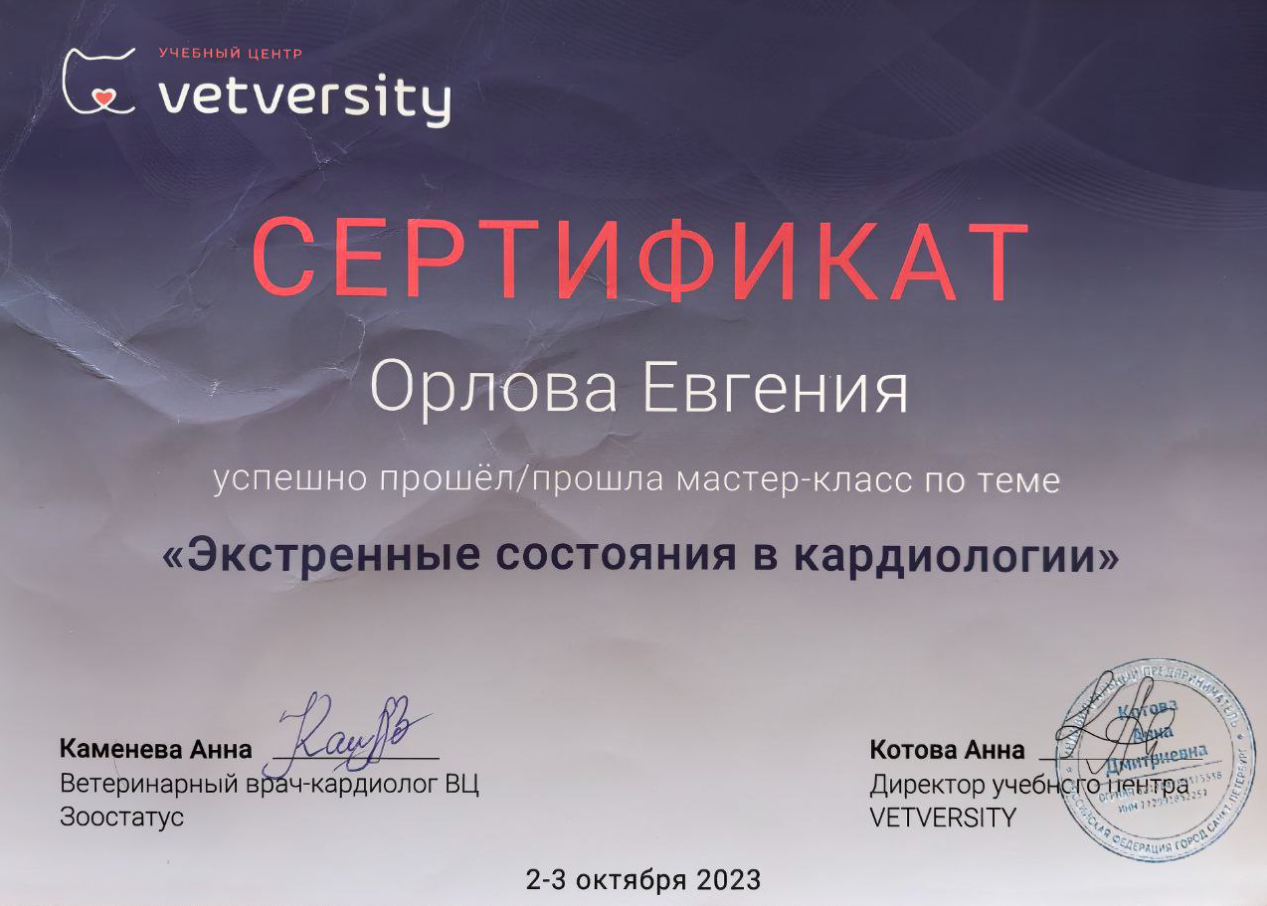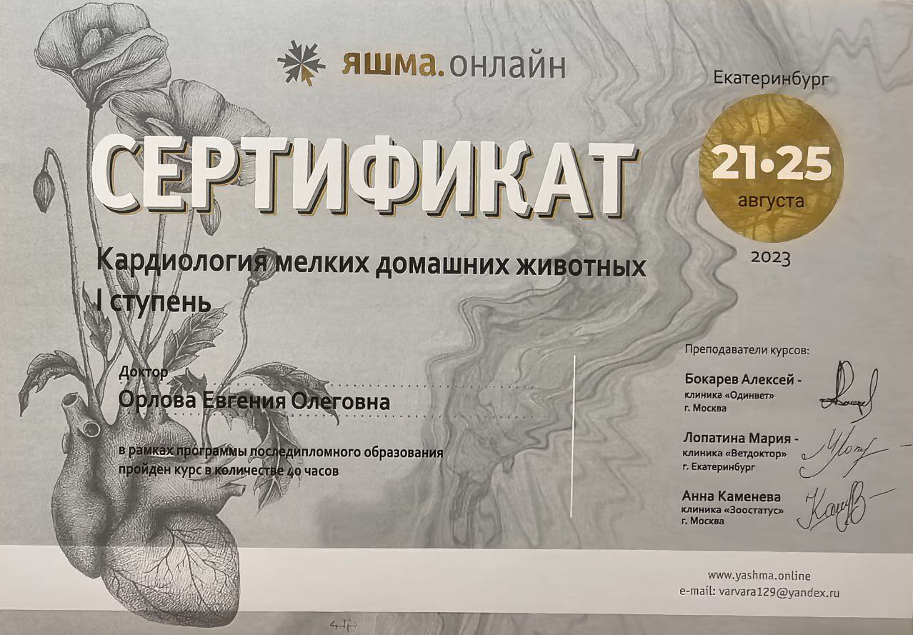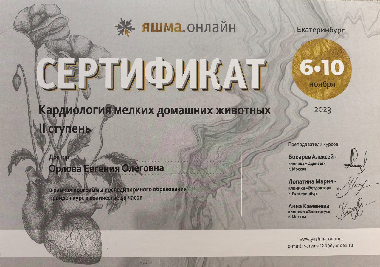 2023 — очный курс по кардиологии мелких домашних животных 1 ступень (40 часов) на базе образовательного центра «Яшма.онлайн», лекторы Бокарёв А.В., Каменева А.В., Лопатина М.Ю.