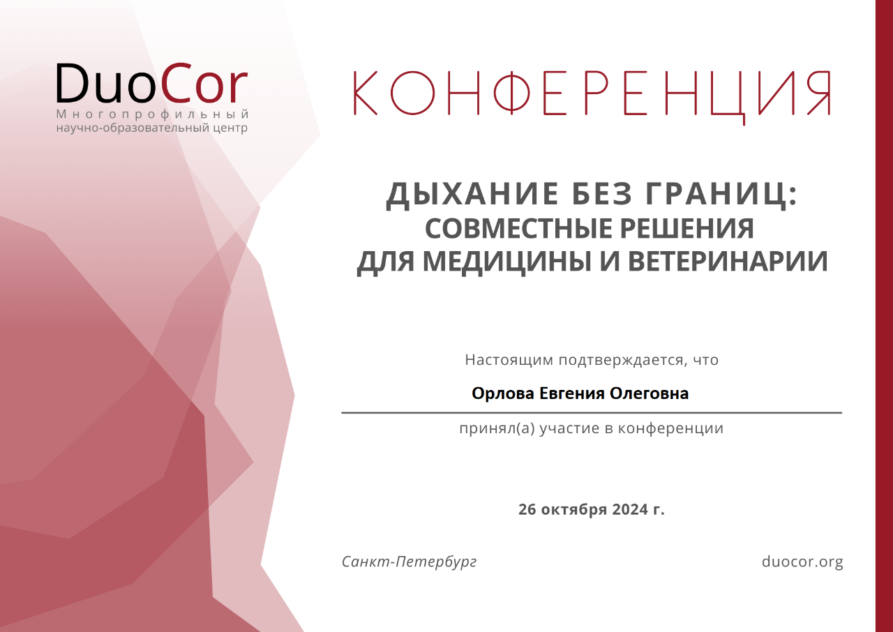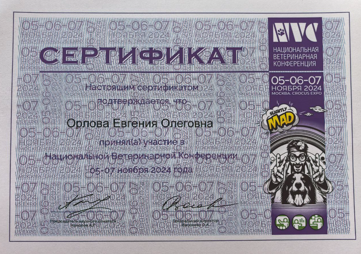Постоянный участник конференций (Национальная ветеринарная конференция, Московский ветеринарный конгресс, Кардиологический ветеринарный конгресс), курсов, лекций и вебинаров.