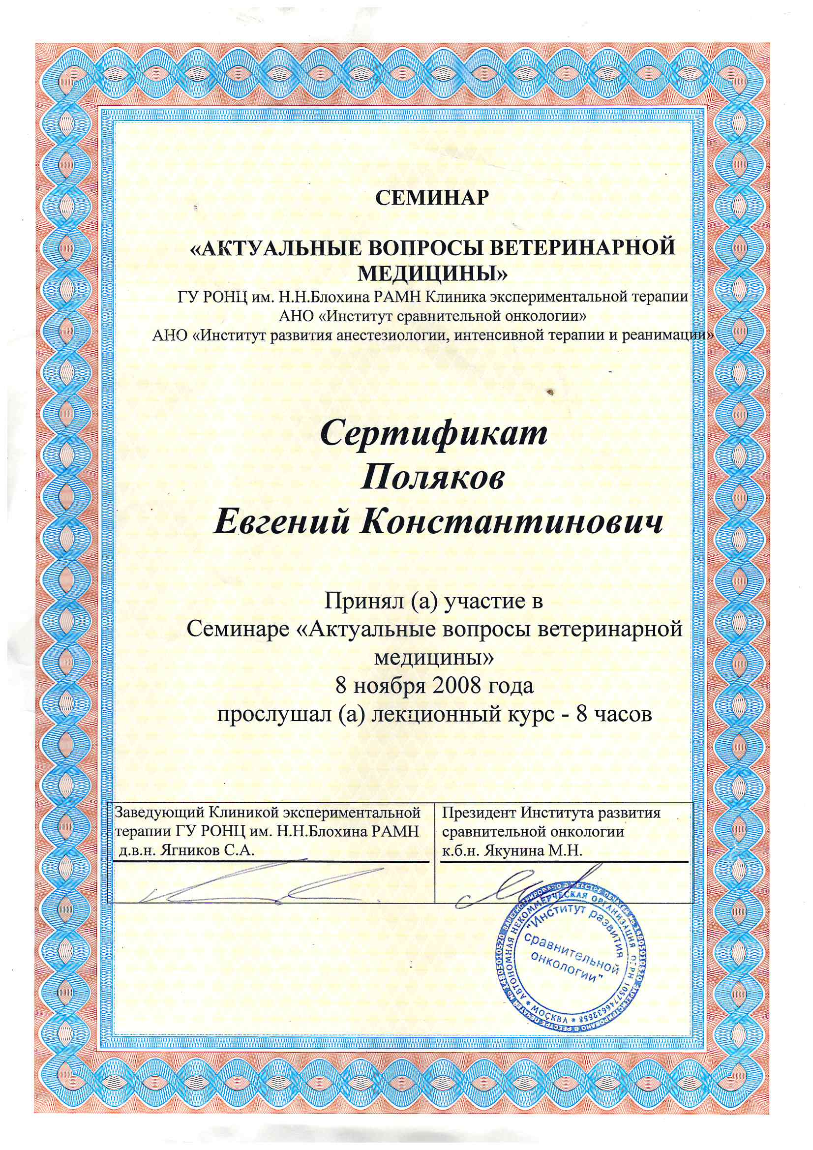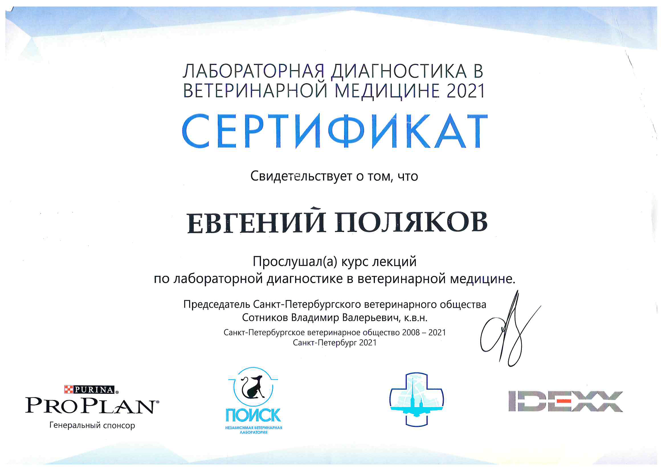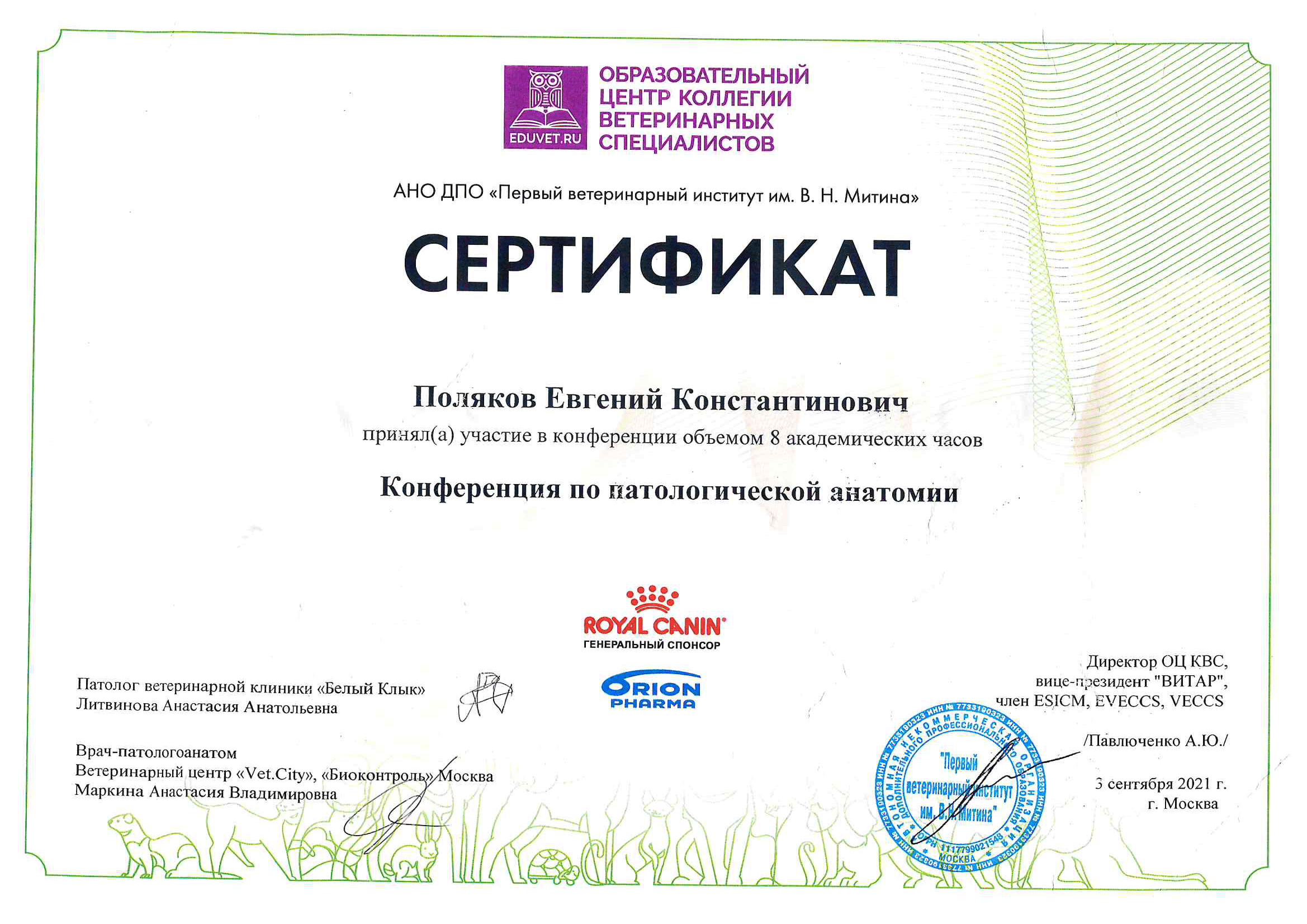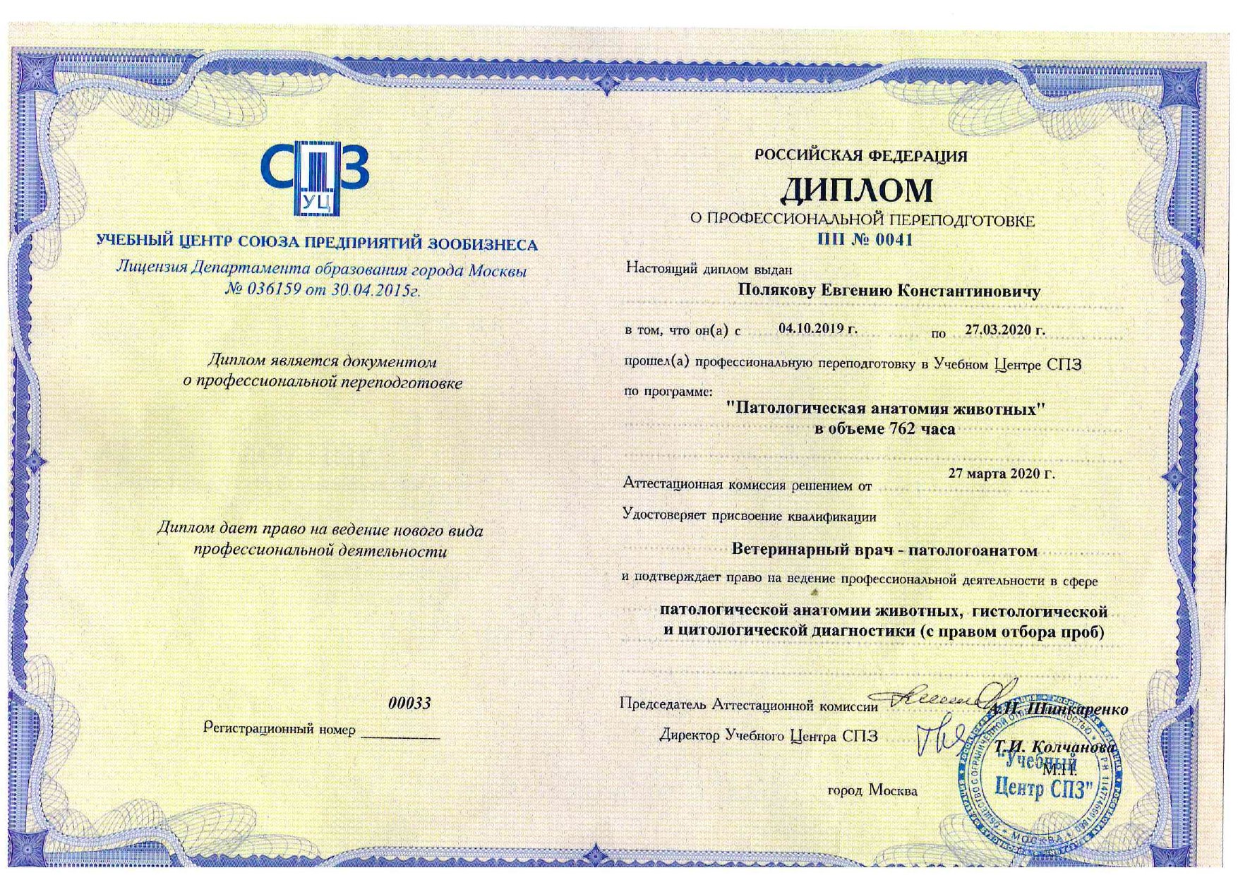 2020 год – окончил курс профессиональной переподготовки по образовательной программе дополнительного профессионального образования «Патологическая анатомия животных» с присвоением квалификации: ветеринарный врач-патологоанатом с правом ведения профессиональной деятельности в области патанатомии, гистологии и цитологии.