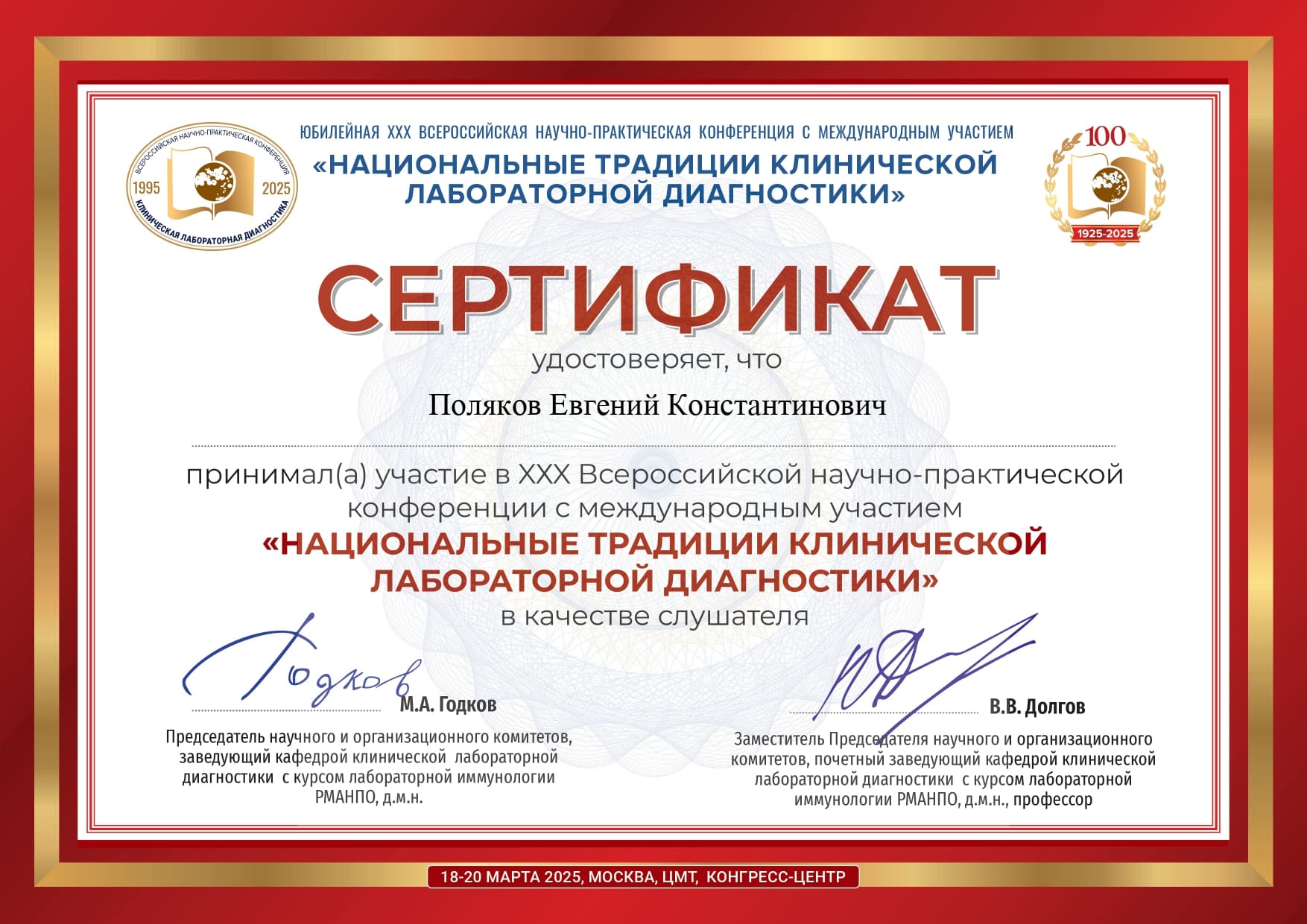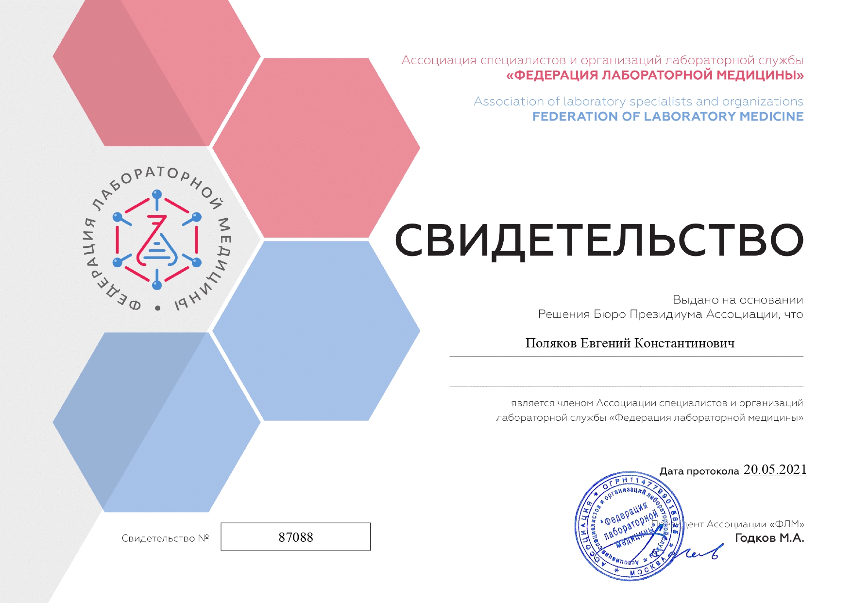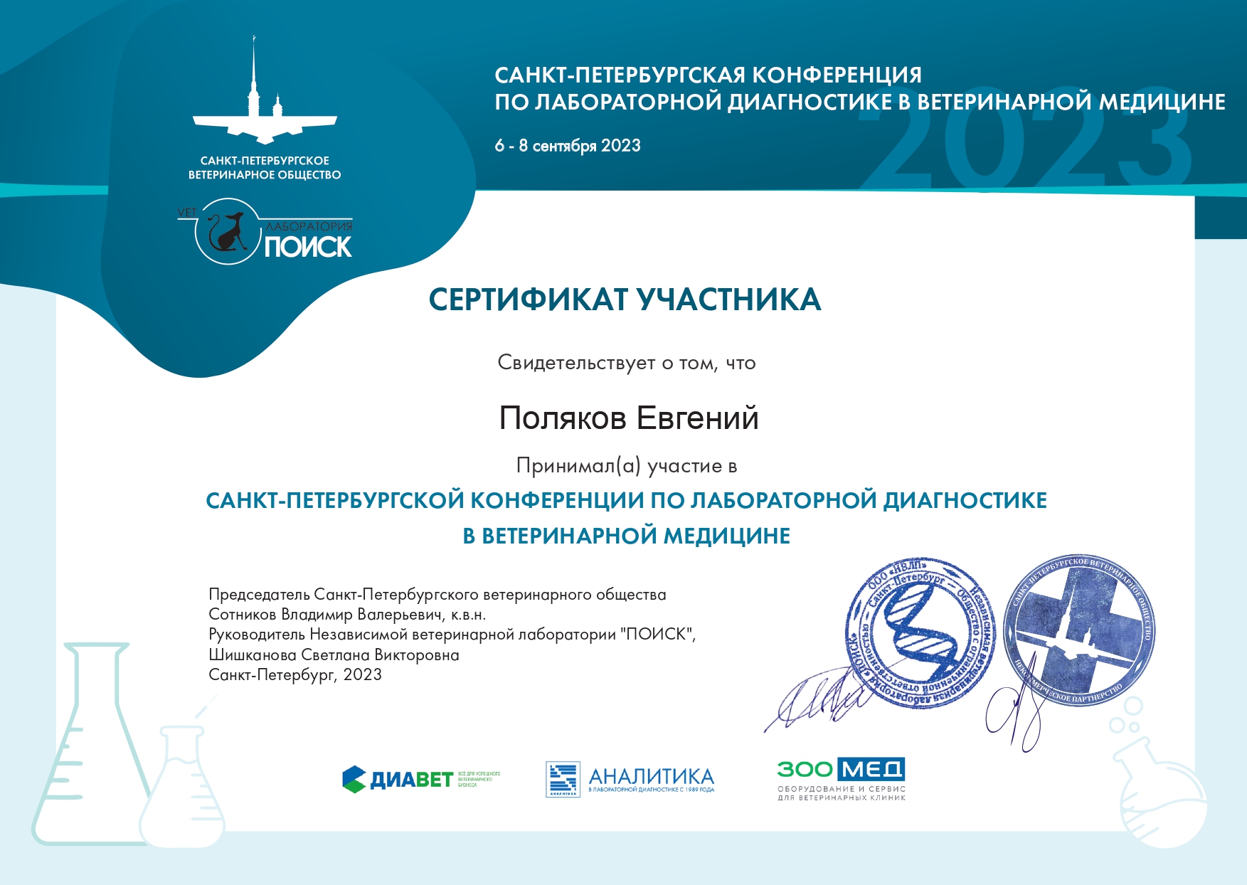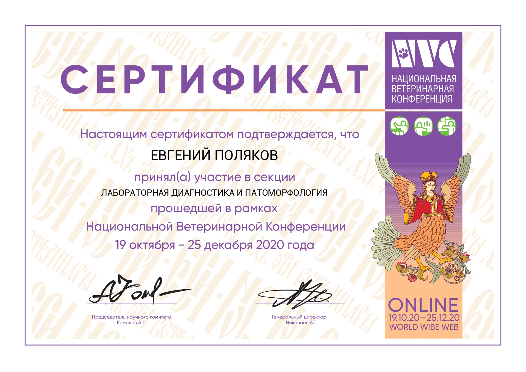 2020 год – окончил курс профессиональной переподготовки по образовательной программе дополнительного профессионального образования «Патологическая анатомия животных» с присвоением квалификации: ветеринарный врач-патологоанатом с правом ведения профессиональной деятельности в области патанатомии, гистологии и цитологии.