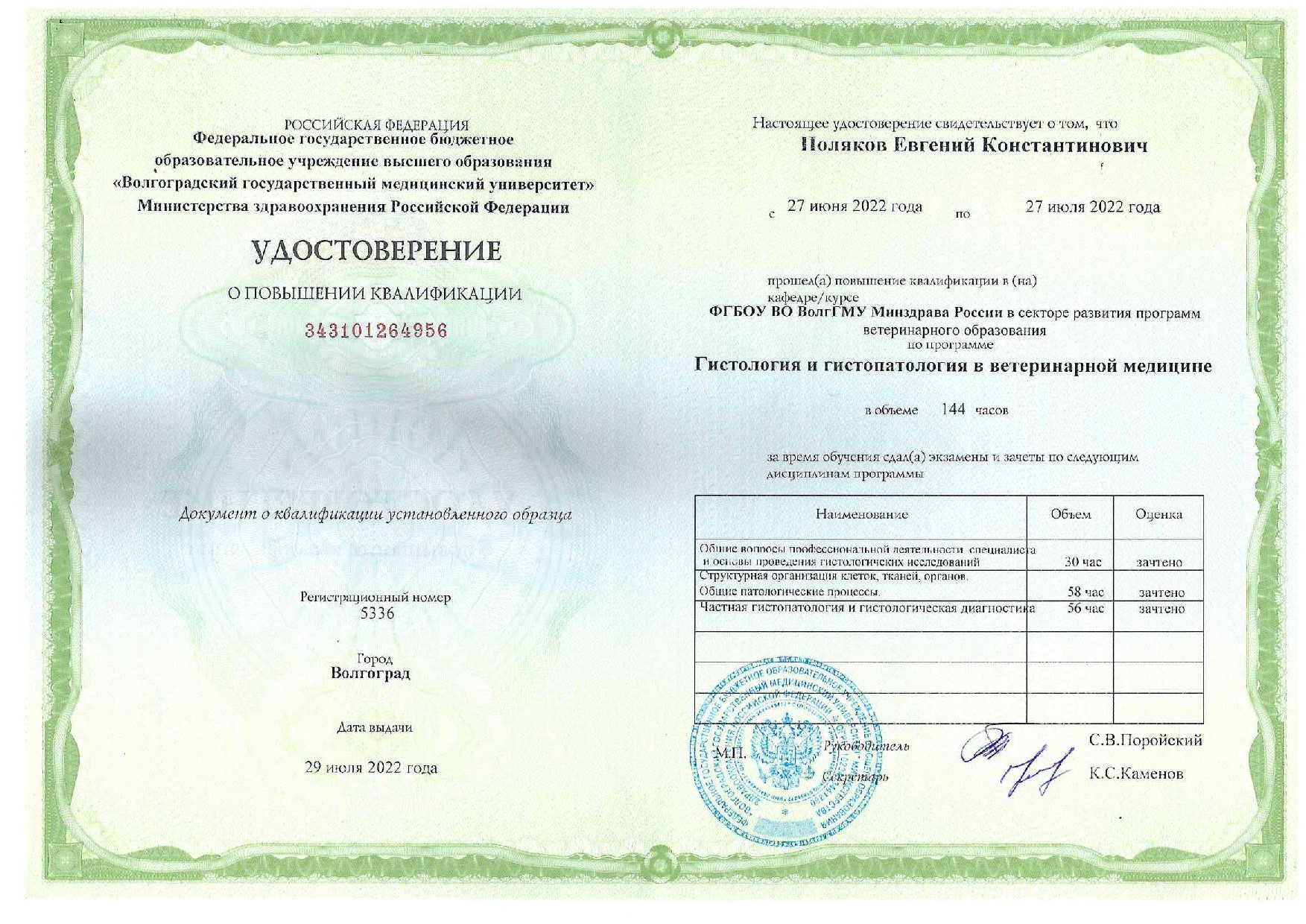 2022 год – повышение квалификации «Гистология и гистопатология в ветеринарной медицине» ФГБОУ ВО ВолгГМУ Минздрава России.