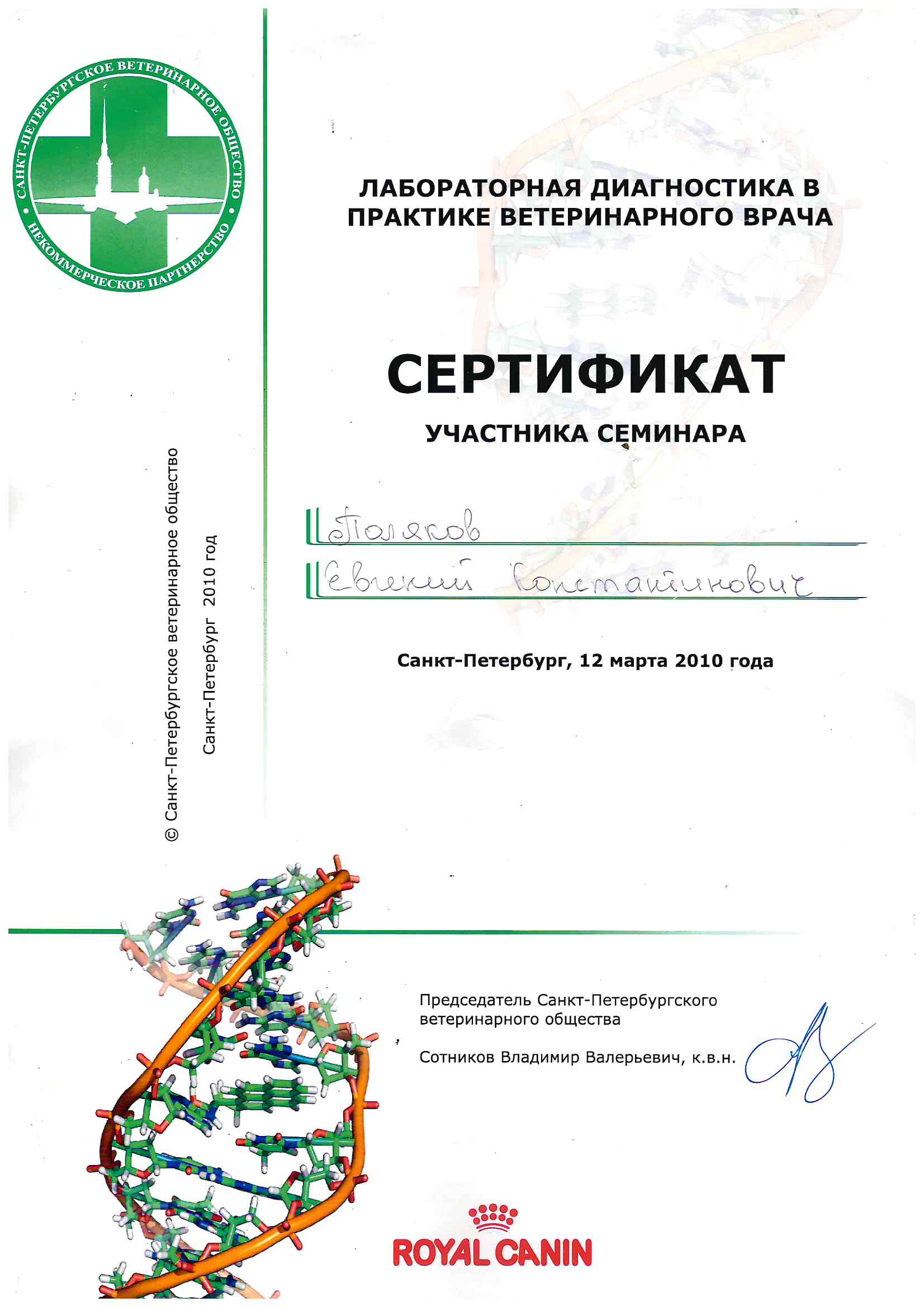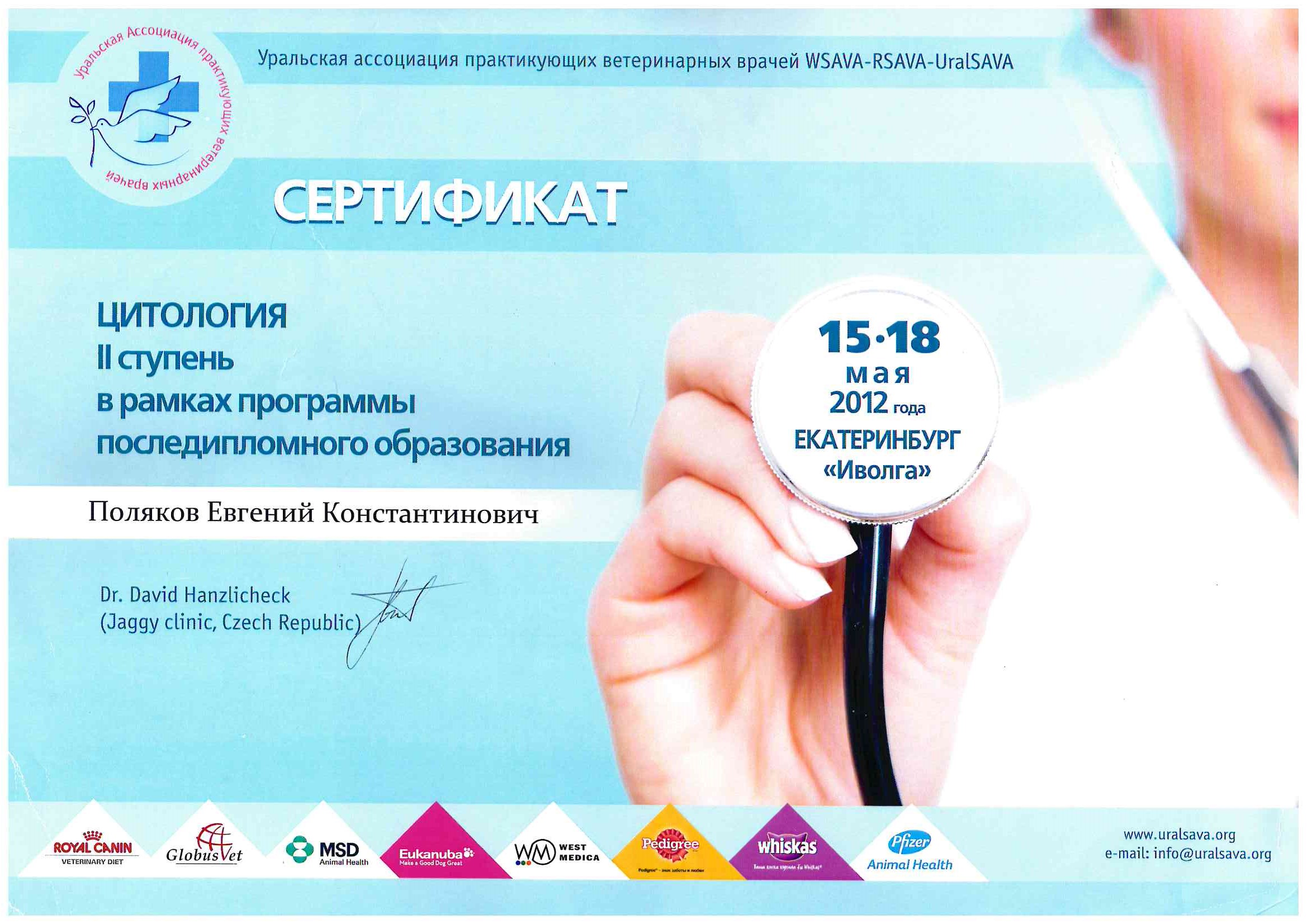 2012 год – постдипломное повышение квалификации в области онкоцитологии – WSAVA-RSAVA-UralSAVA, цитология.