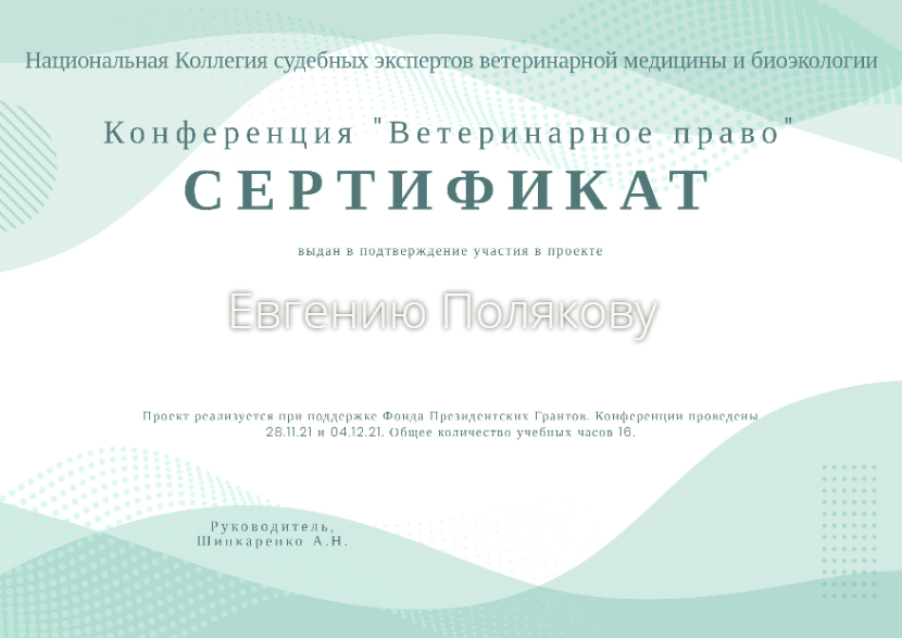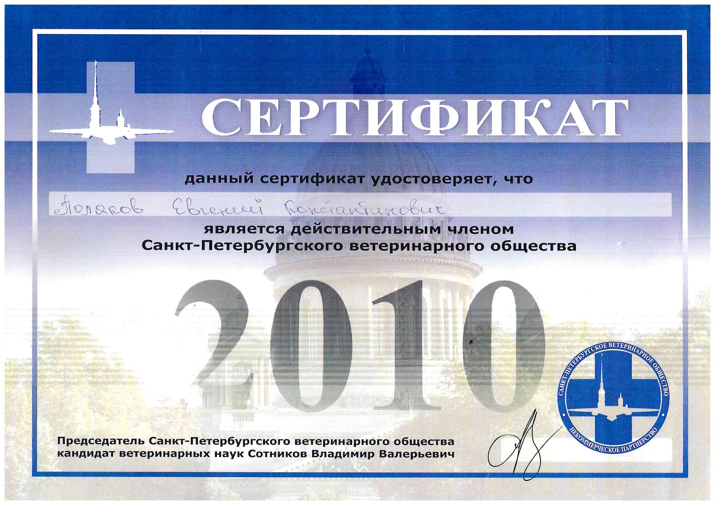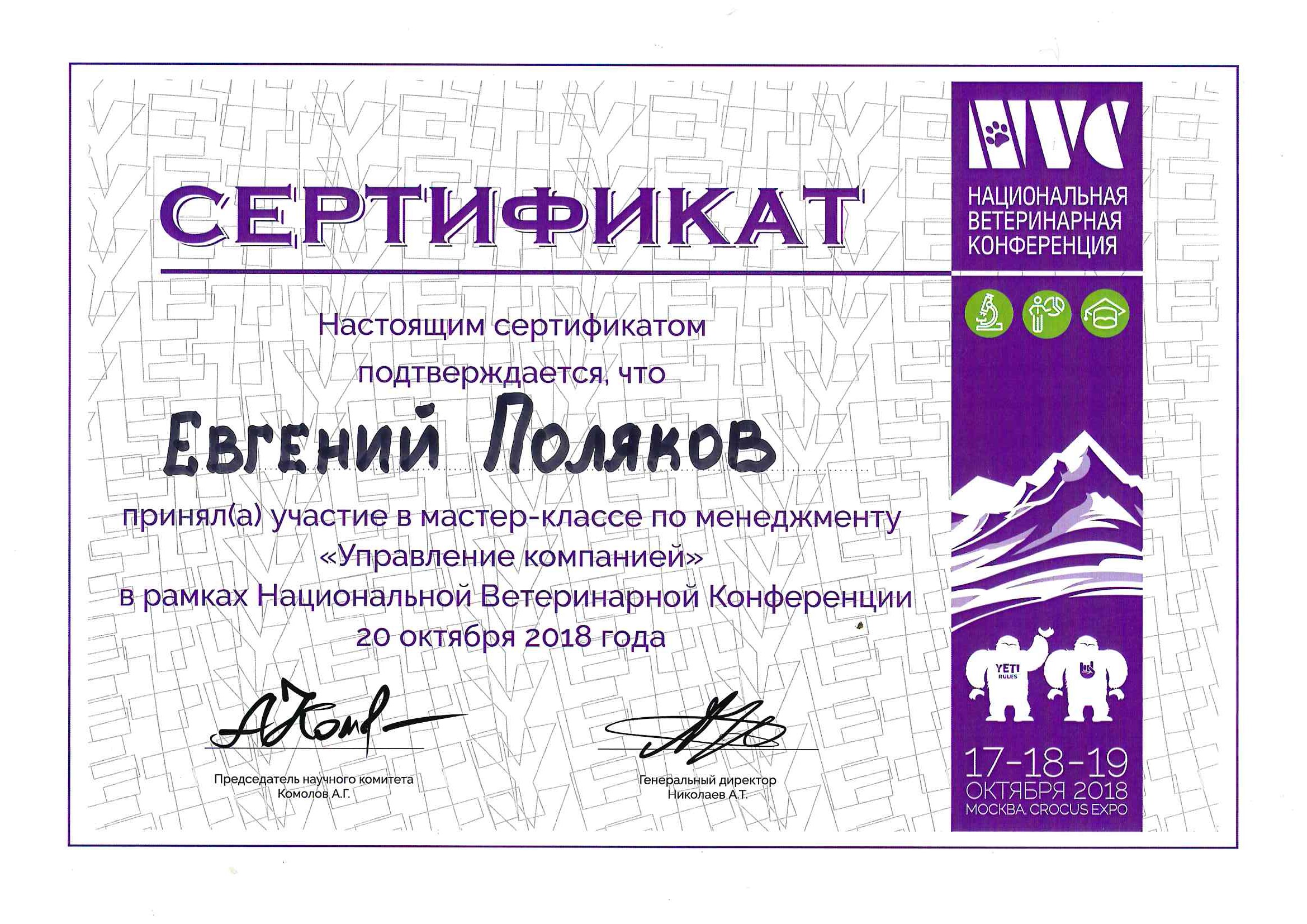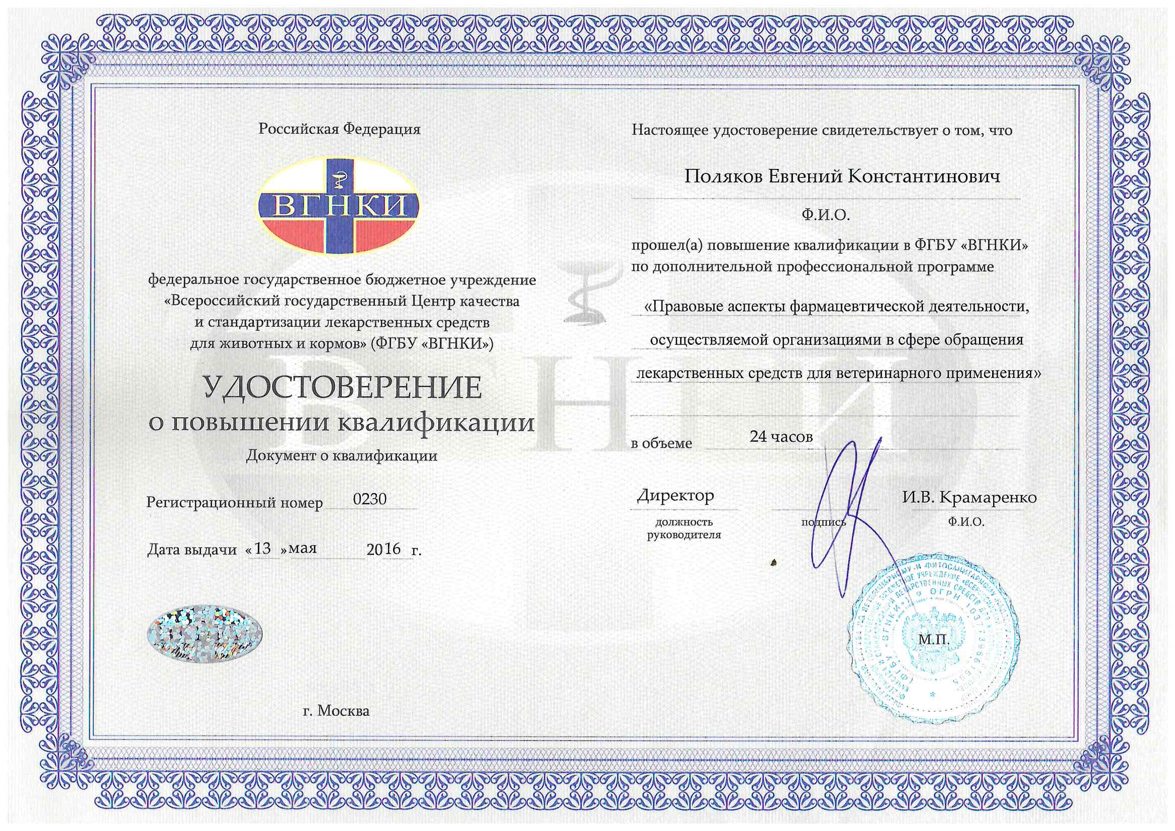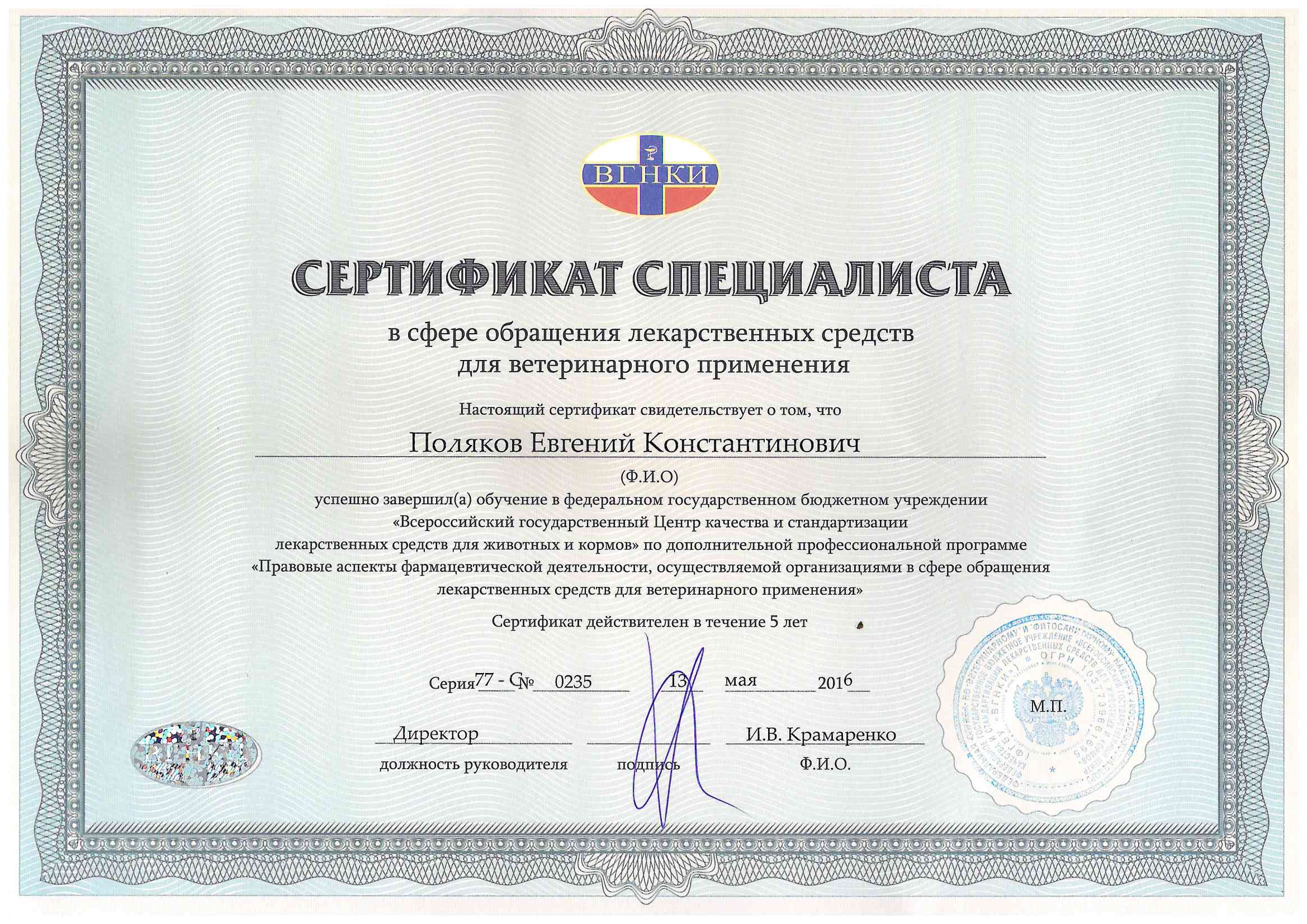 2016 год – сертификат специалиста в сфере обращения лекарственных средств для ветеринарного применения ВГНКИ, фармакология.