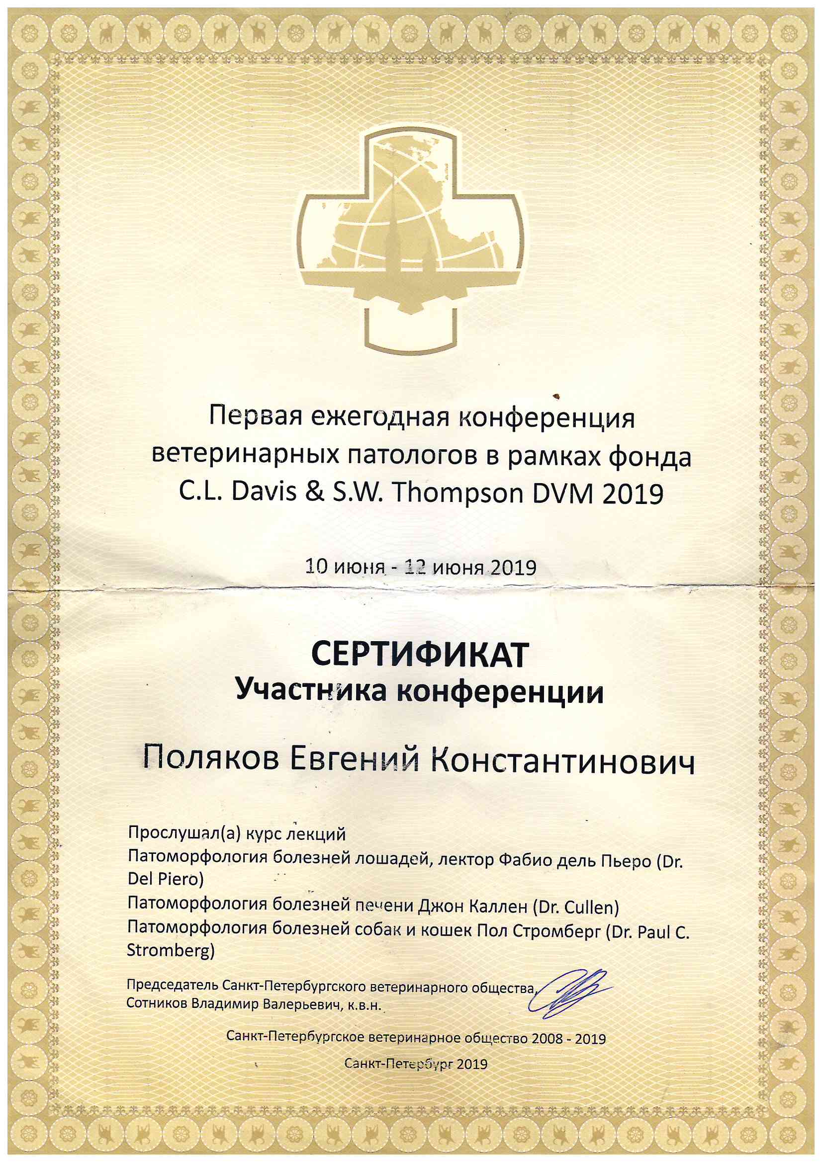 2019 год – курс лекций по патоморфологии мелких домашних животных и лошадей C.L. DAVIS/S.W.THOMPSON, D.V.M. FOUNDATION – СПБВО, патоморфология.