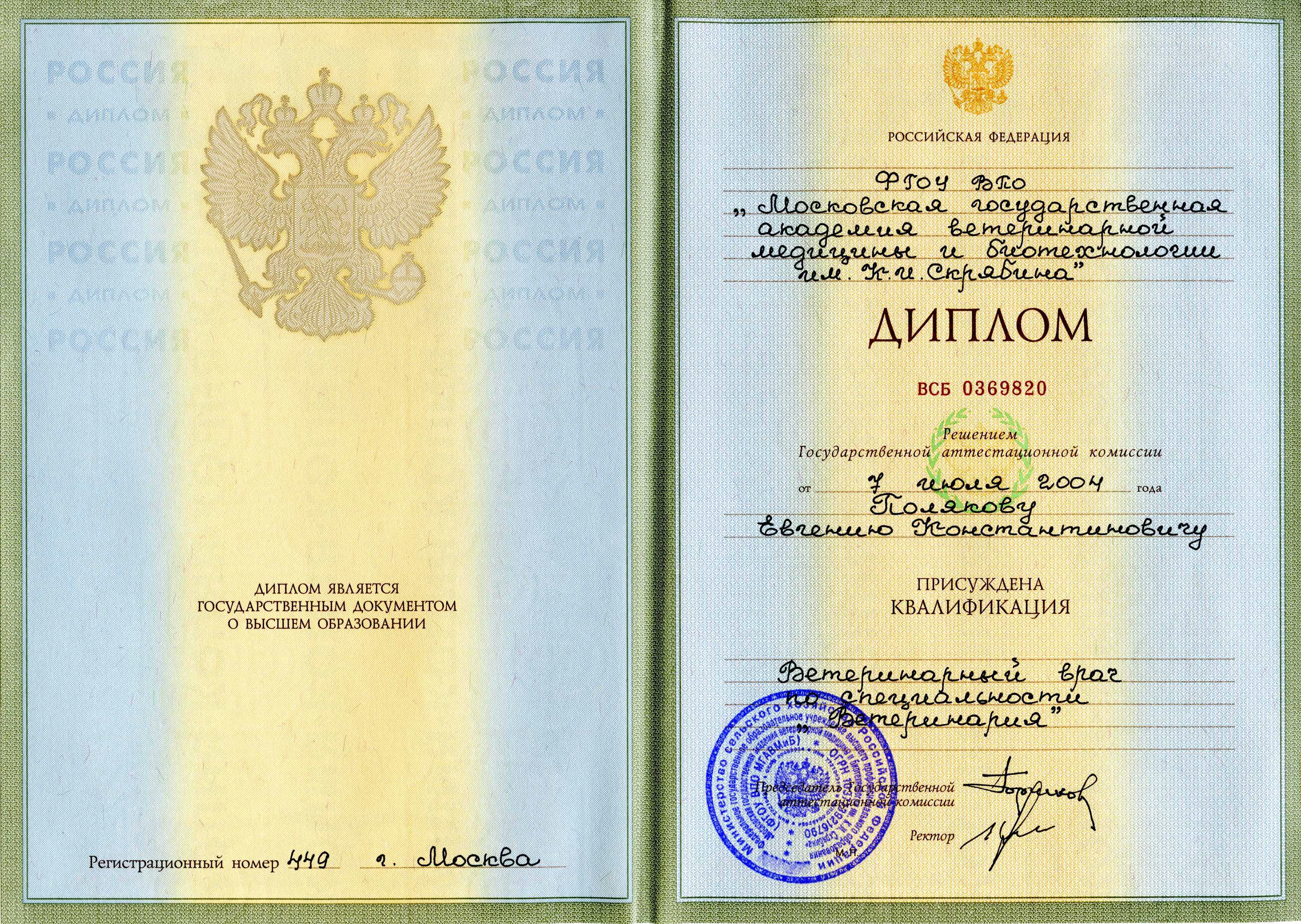 2004 год – окончил Московскую государственную академию ветеринарной медицины и биотехнологии имени К.И. Скрябина, факультет ветеринарной медицины.