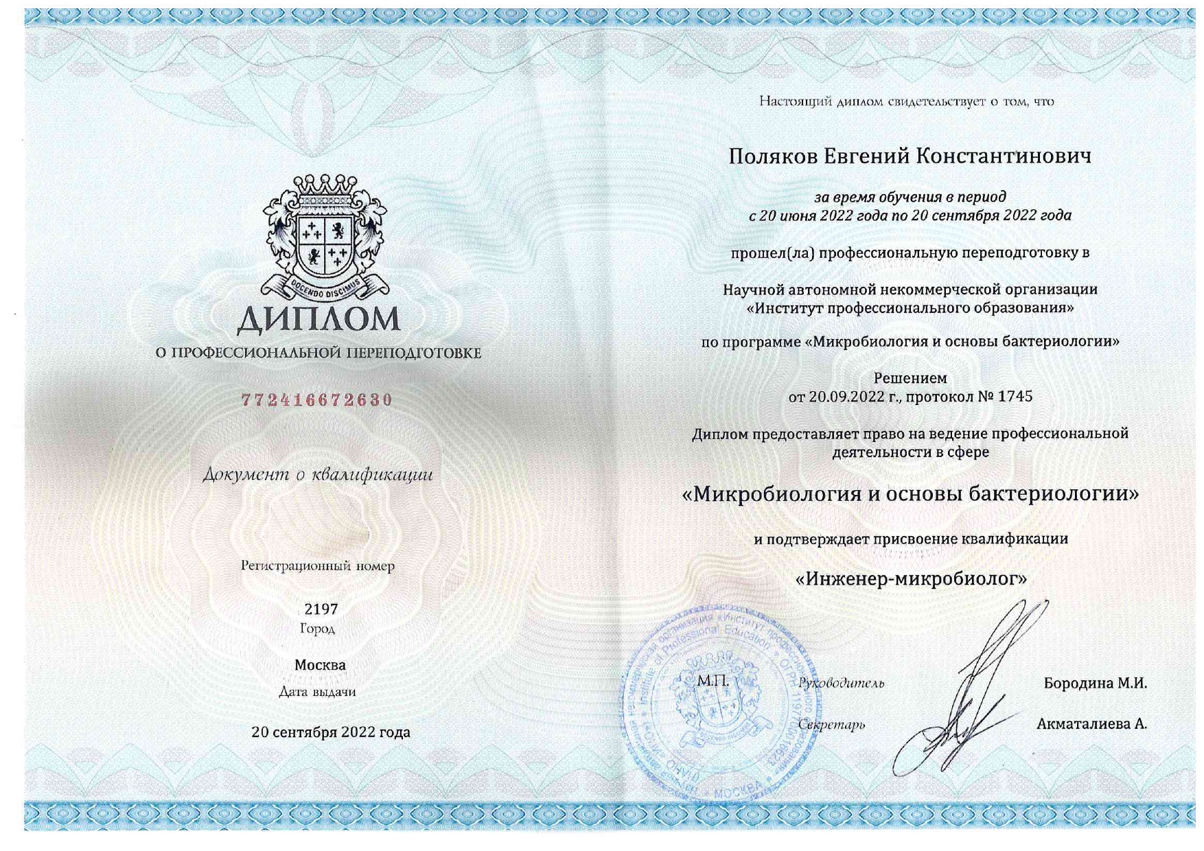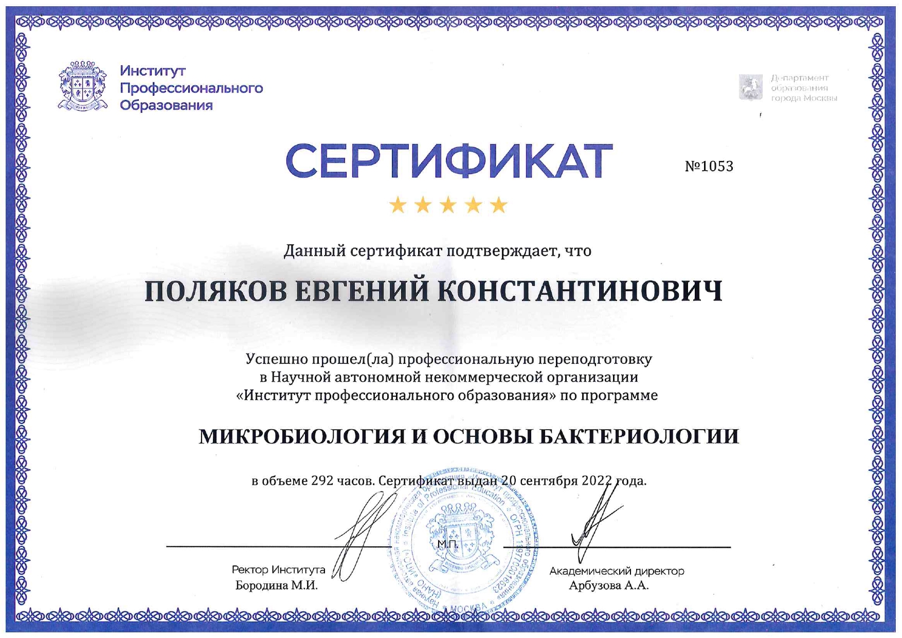 2022 год – прошел профессиональную переподготовку по образовательной программе дополнительного профессионального образования «Микробиология и основы бактериологии» с присвоением квалификации: инженер-микробиолог с правом ведения профессиональной деятельности в сфере микробиологии.