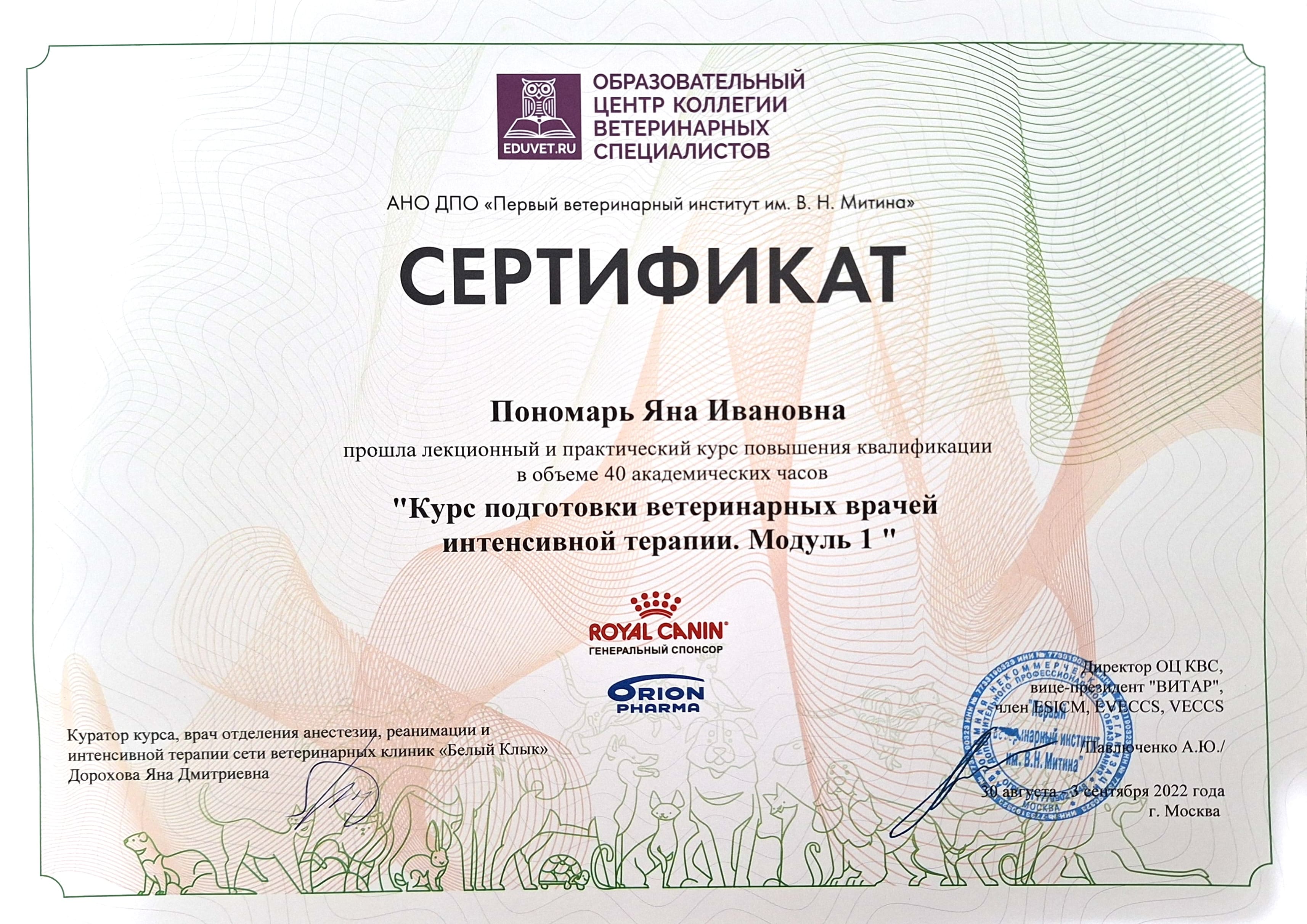 2022 — повышение квалификации в «Первом ветеринарном институте им В.Н.Митина» по программе «Базовый курс интенсивной терапии собак и кошек».