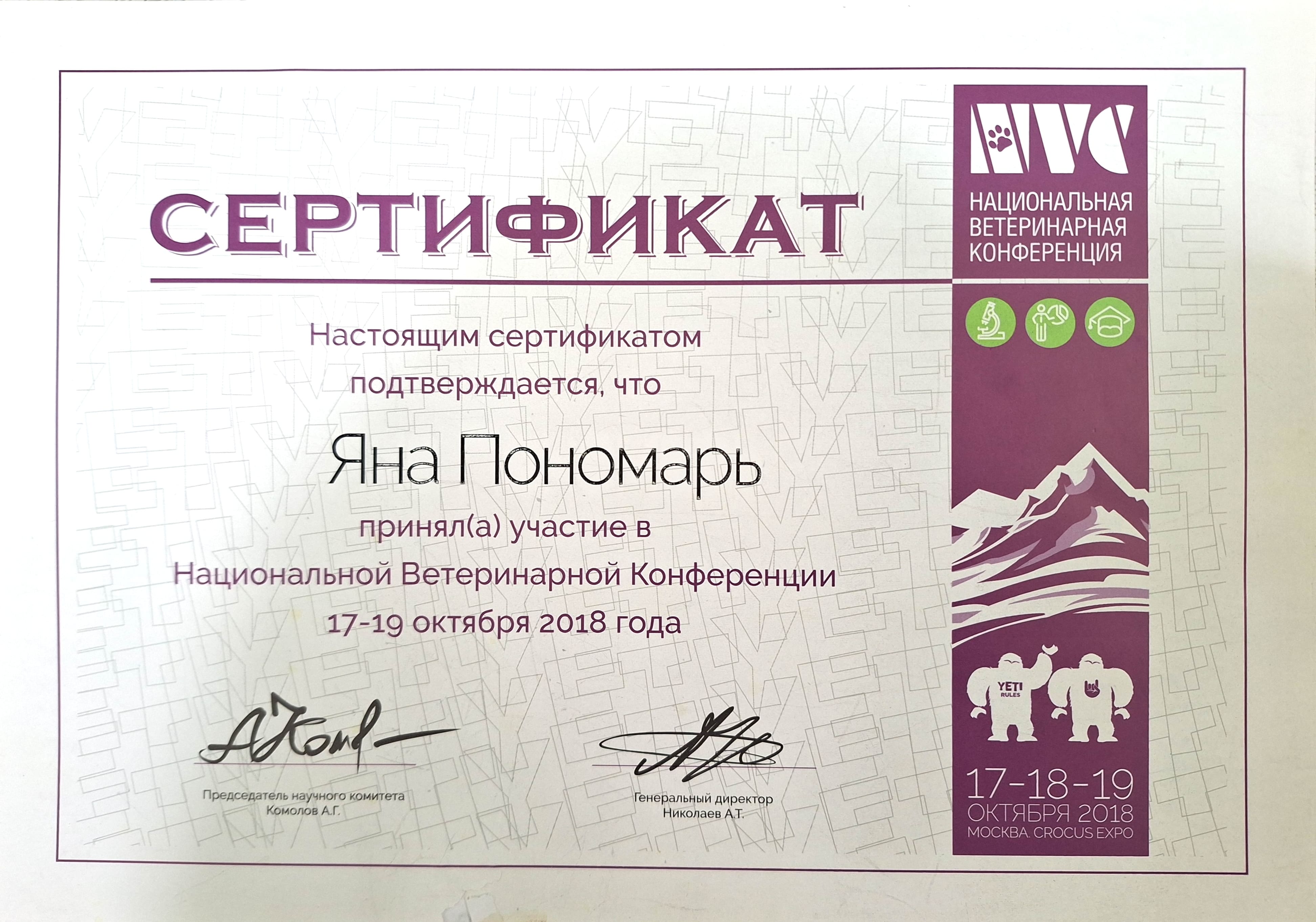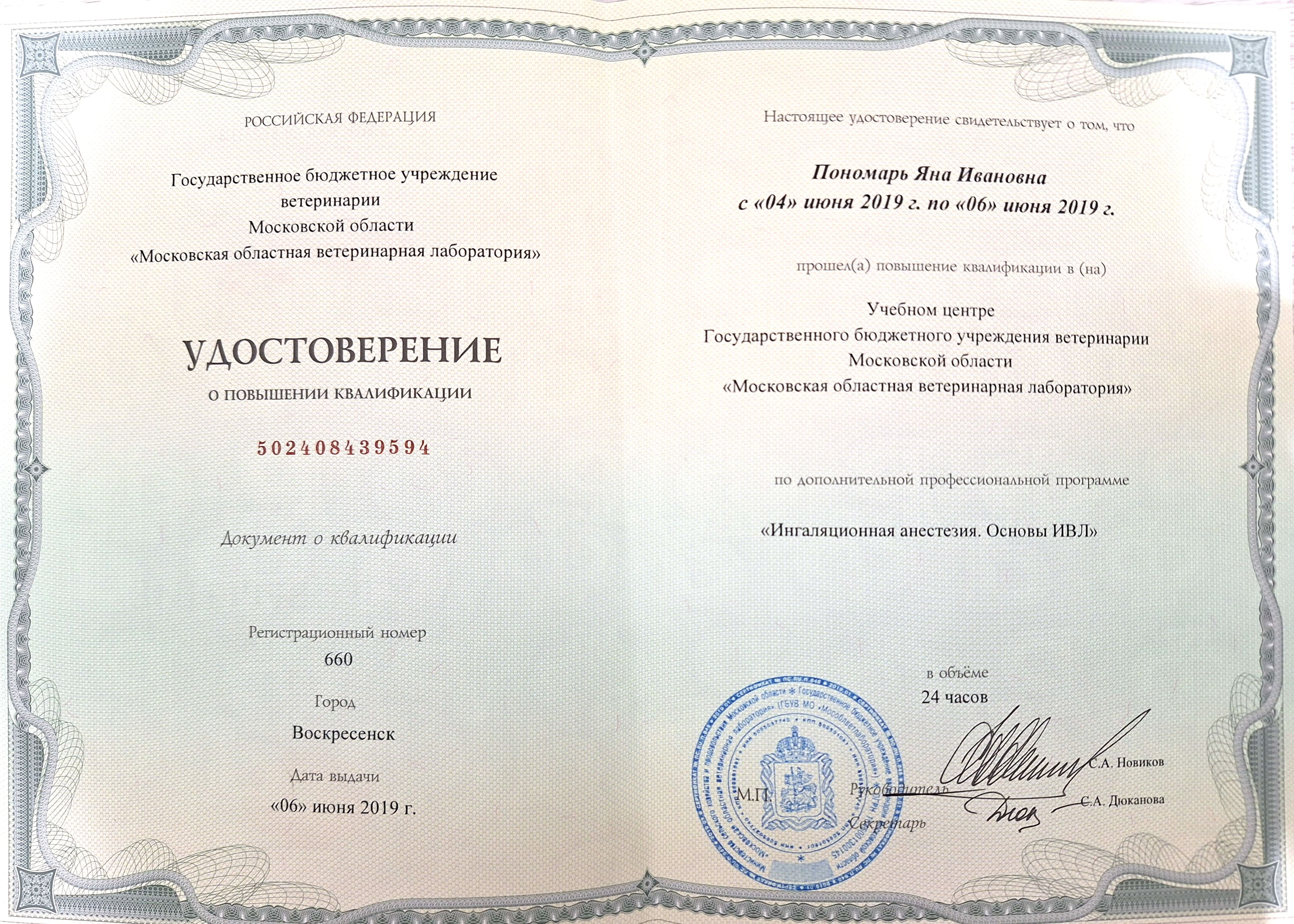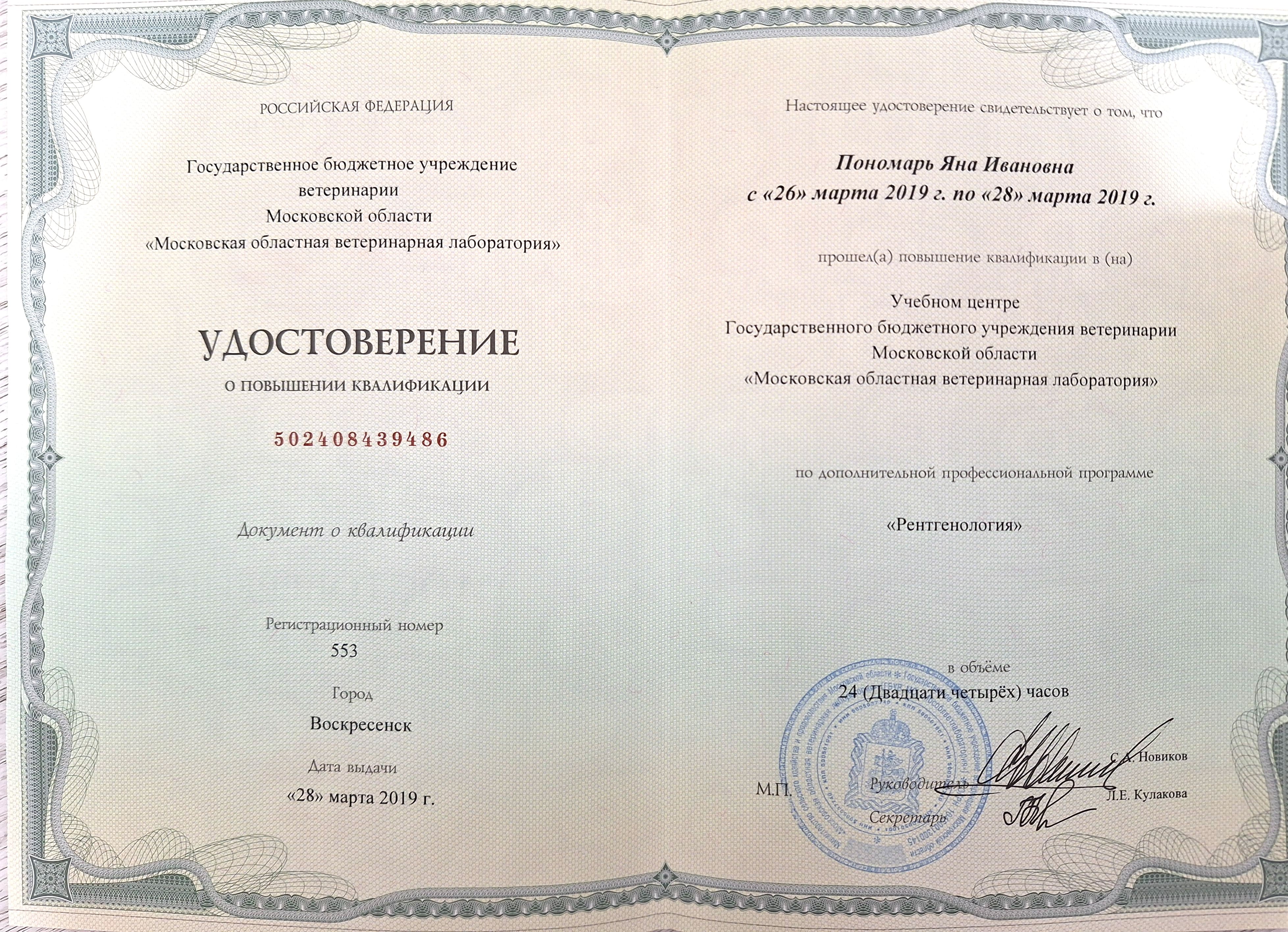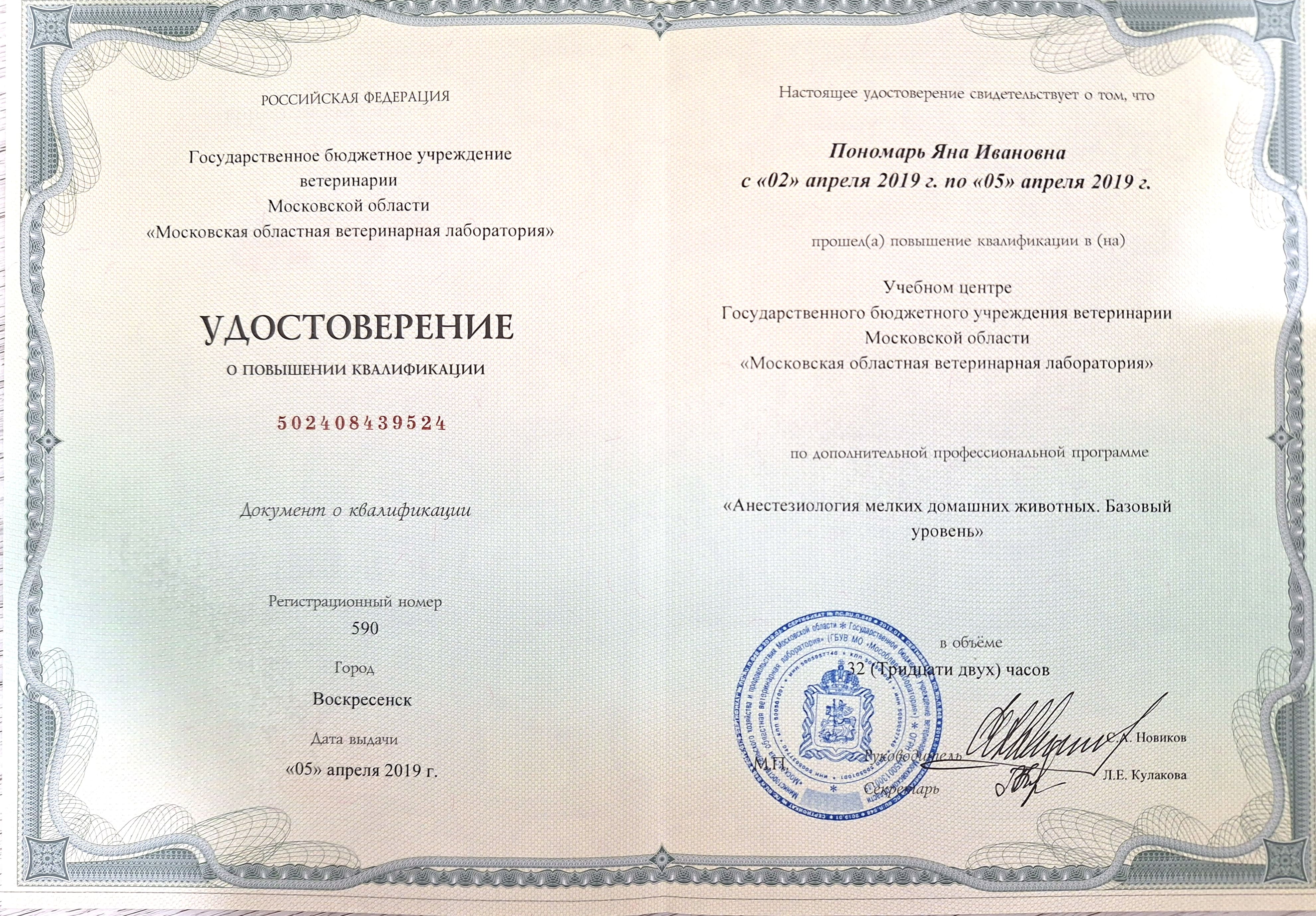 2019 — курс повышения квалификации в учебном центре ГБУ ветеринарии МО «Московская областная ветеринарная лаборатория» по дополнительной профессиональной программе «Рентгенология», «Анестезиология мелких домашних животных», «Ингаляционная анестезия. Основы ИВЛ», «Региональная анестезия.