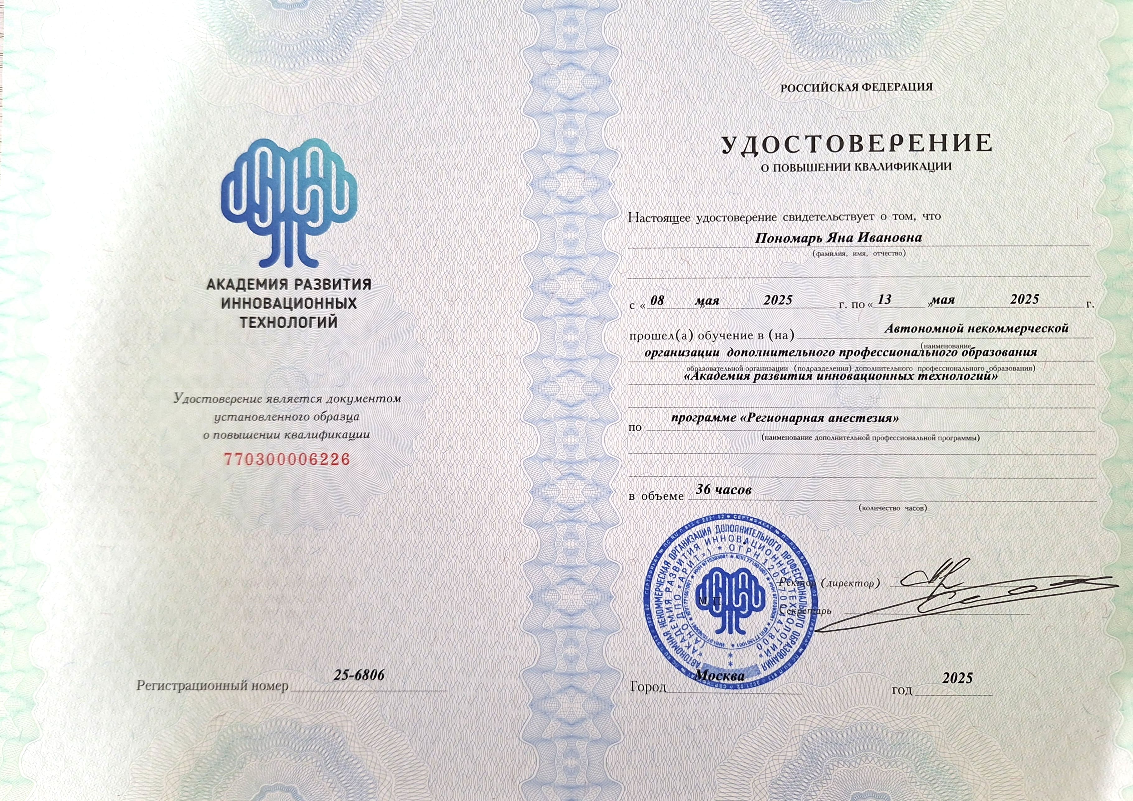 2025 — курс повышения квалификации в «Академии развития инновационных технологий» по программе «Регионарная анестезия».