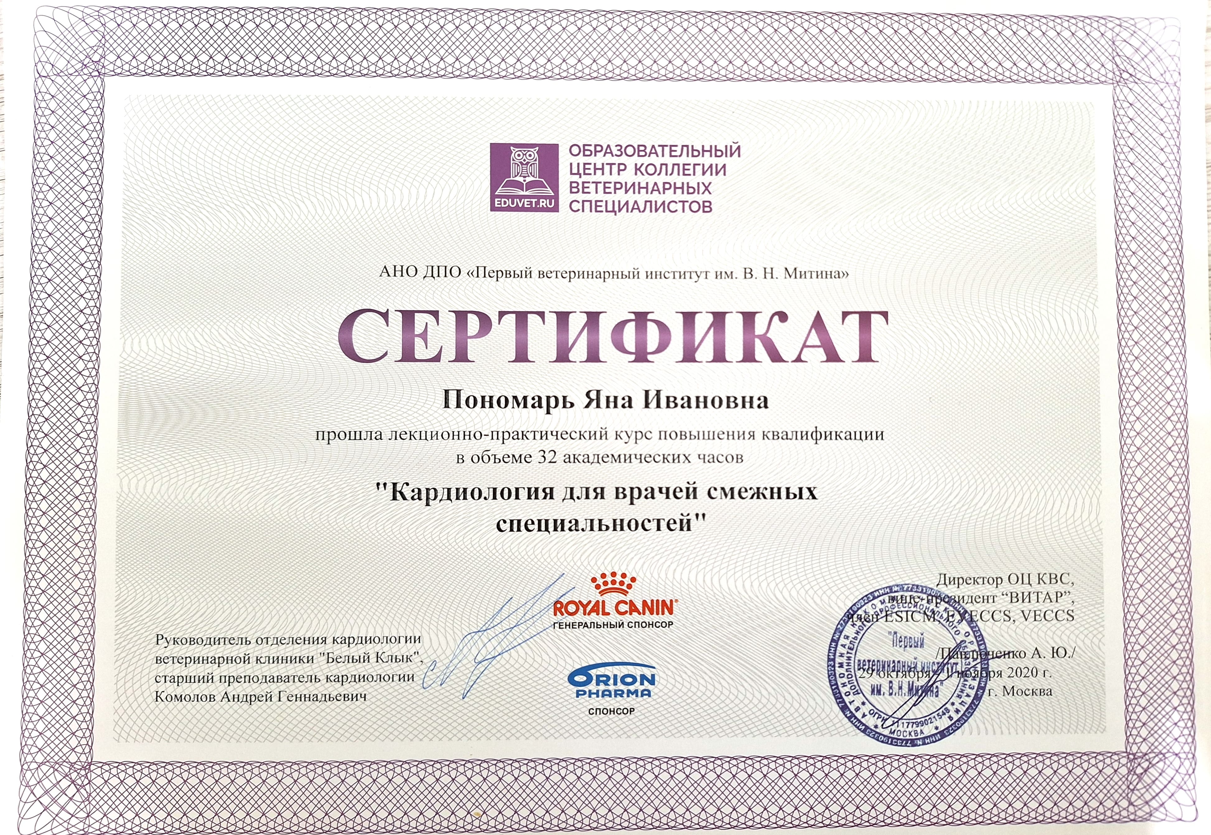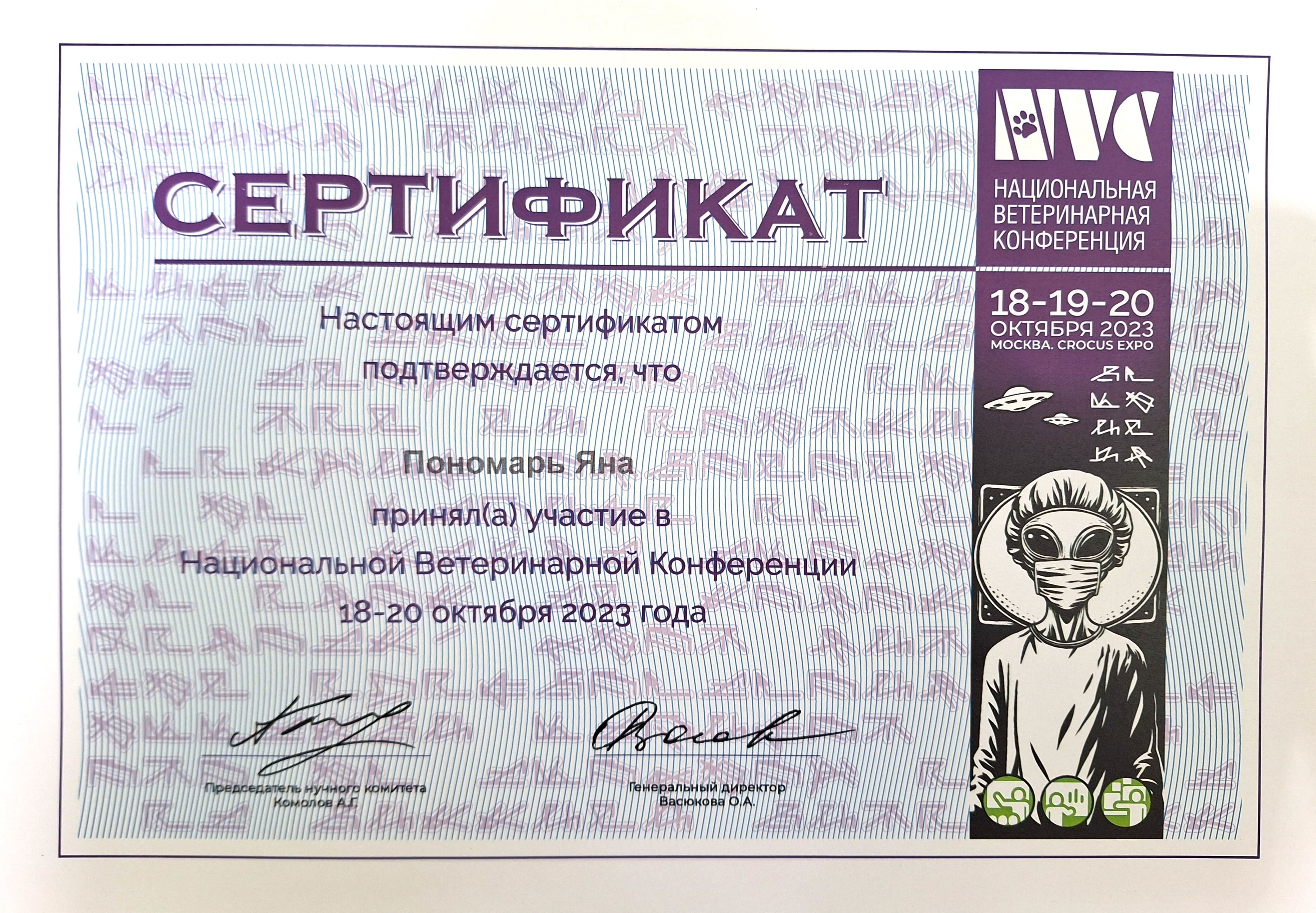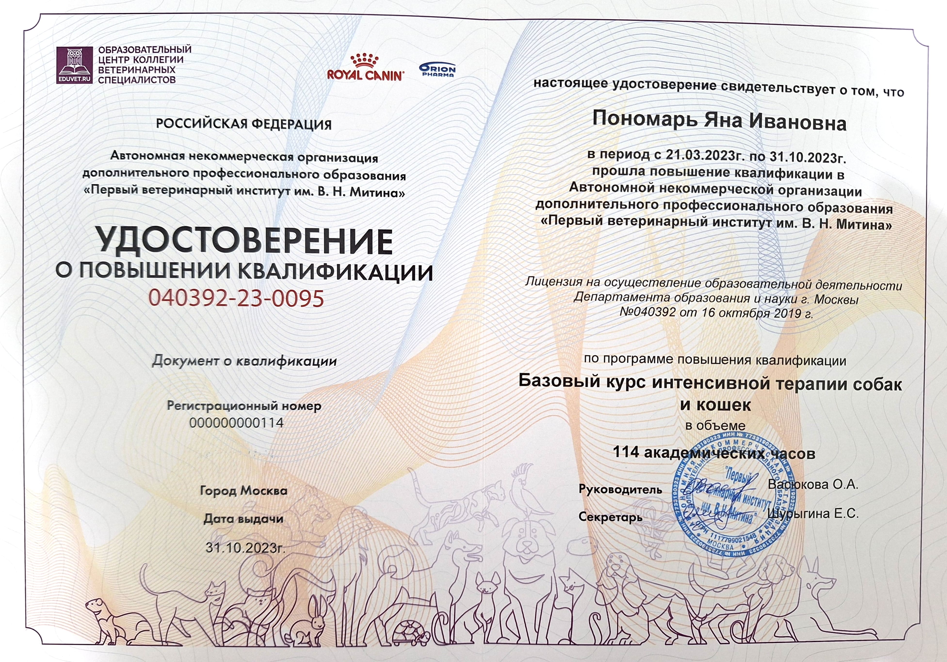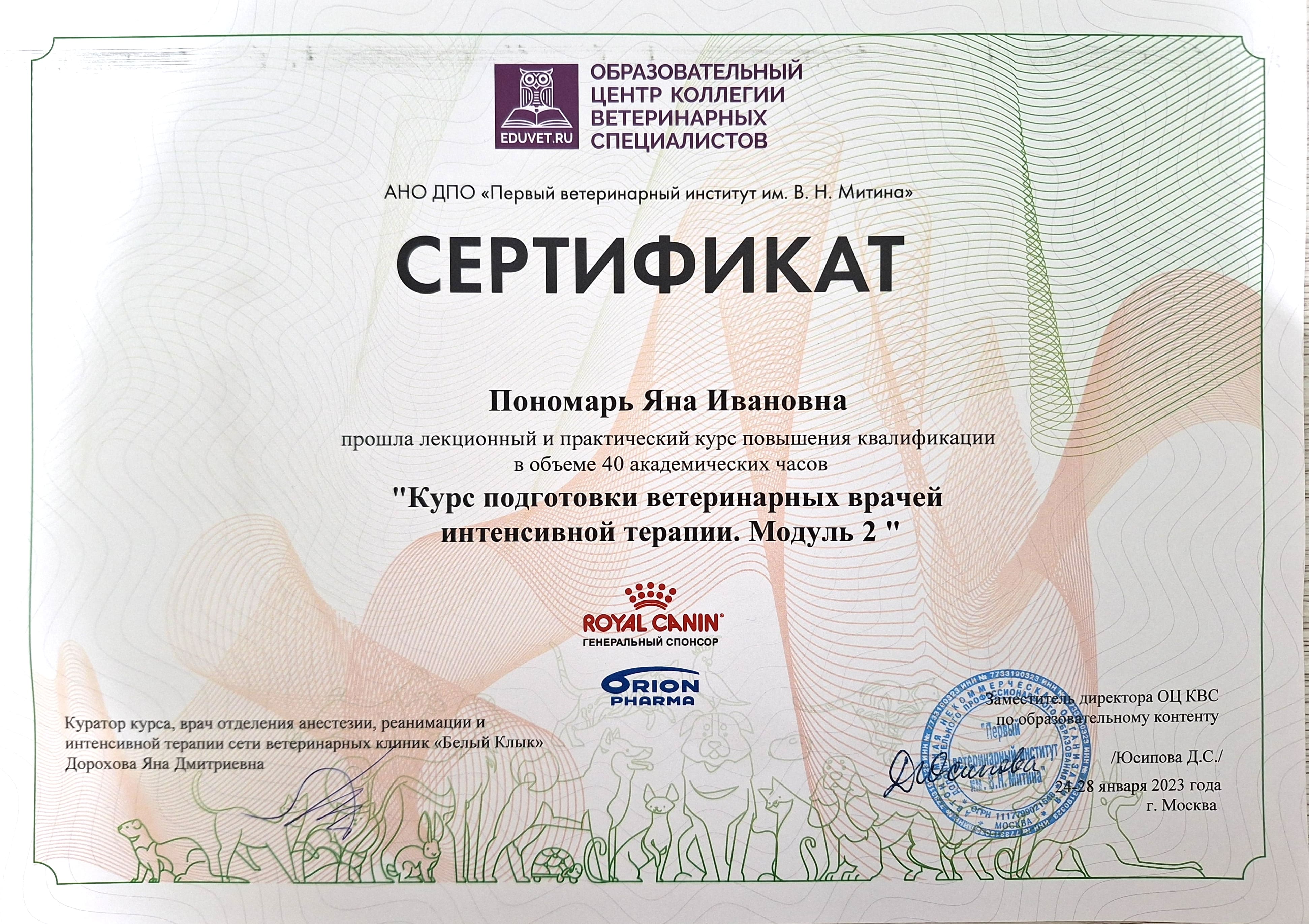 2023 — курс повышения квалификации в «Первом ветеринарном институте им В.Н.Митина» по программе «Курс подготовки ветеринарных врачей интенсивной терапии. Модуль 2».