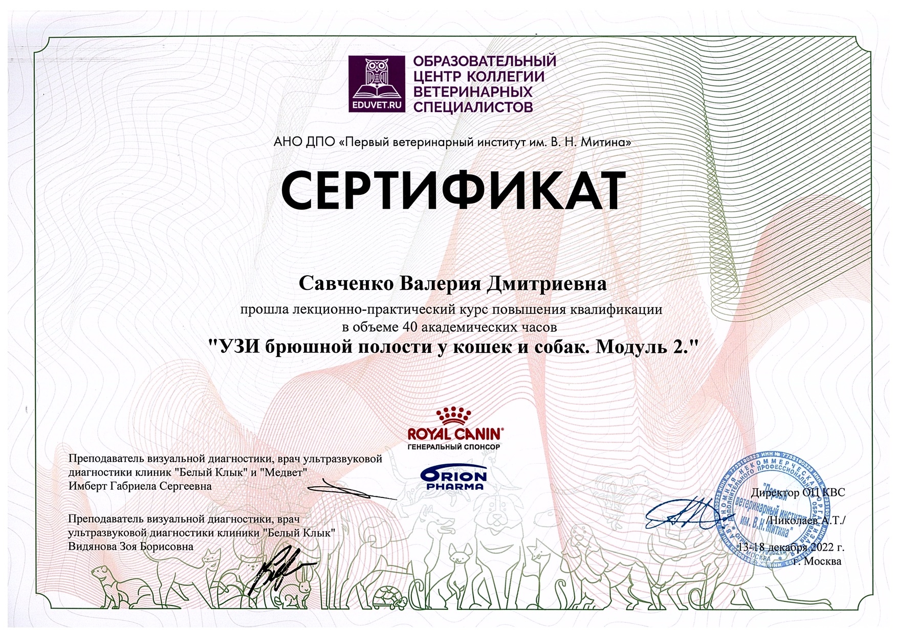 Декабрь 2022 год – прошла курс повышения квалификации «УЗИ брюшной полости у кошек и собак. Модуль 2» в АНО ДПО «Первый ветеринарный институт им. В. И. Митина».